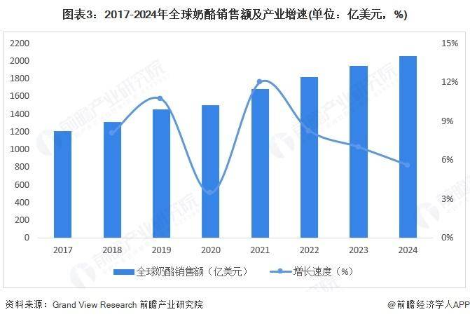 根据Grand View Research数据显示,2017-2021年全球奶酪消费规模不断上涨。2020年,受新冠肺炎疫情的影响,零售端的奶酪市场出现了消费热潮,全球奶酪市场销售额出现大幅增长,达到1355.25亿美元,涨幅为8.6%。2023年,全球奶酪市场规模为1946亿美元,2024年同比增长5.6%,2025年至2030年的复合年增长率为5.6%。这归因于消费者对多样化和异国风味食品的口味和偏好的不断变化、对植物基奶酪产品的需求不断增长、新型独特奶酪品种的推出以及烹饪趋势的全球化。全球奶酪行业正在向可持续性和效率转型。