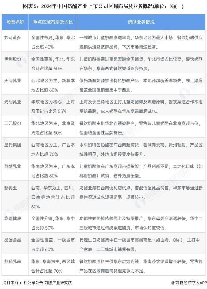 中国奶酪企业区域布局呈现全国性与区域性分化。妙可蓝多、伊利、蒙牛覆盖全国,重点深耕华东、华北及华南,主推儿童奶酪并加速下沉市场渗透。光明、三元、天润等区域乳企聚焦本地,光明以华东为核心,三元深耕华北,天润依托新疆辐射西北,通过餐饮渠道与特色产品巩固优势。皇氏、燕塘、新乳业立足西南与华南,试水水牛奶酪及短保产品,区域性消费特征显著。品渥、健合等通过高端商超与母婴渠道主攻一二线城市,熊猫乳品与一鸣食品则专注华东餐饮供应。整体呈现头部全国扩张、区域品牌本地深耕、细分渠道差异化并存的格局。